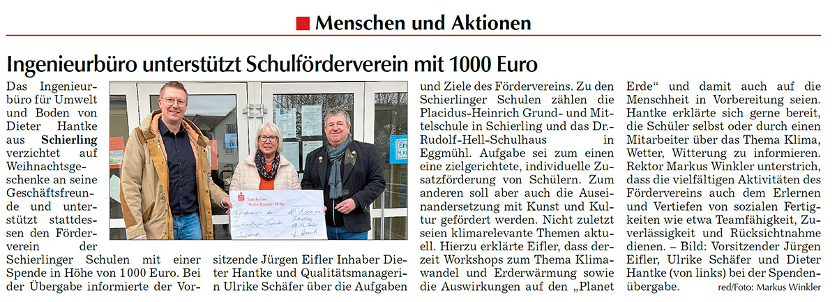 - Im Dezember 2014 spendete unser Institut 500 Euro an den Schulförderverein Schierling.